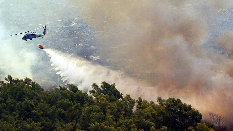 SAN DIEGO (Oct. 23, 2007) - An MH-60S Seahawk assigned to Helicopter Sea Combat Squadron (HSC) 85, dumps water from a full 420-gallon extinguishing trough onto of one of the many areas in San Diego County suffering from an ongoing wildfire. The blaze has already forced more than 250,000 people from their homes. U.S. Navy photo by Mass Communication Specialist 2nd Class Chris Fahey