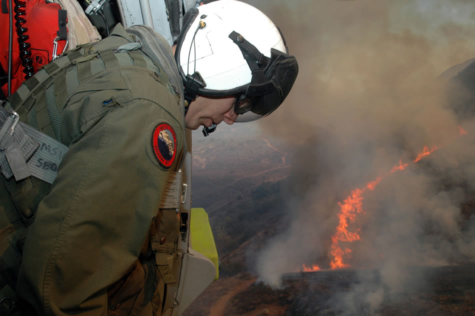 SAN DIEGO (Oct. 23, 2007) - Chief Aviation Electronics Technician Rexford Sackett, assigned to Helicopter Sea Combat Squadron (HSC) 85, looks upon miles of burnt terrain as he and other Sailors prepare to help fend off the blaze aboard an MH-60S Seahawk. HSC-85 is providing helicopters specially equipped with a 420-gallon extinguishing trough used to dump water on San Diego's ongoing fire disaster. The blaze has already forced more than 250,000 people from their homes. U.S. Navy photo by Mass Communication Specialist 2nd Class Chris Fahey