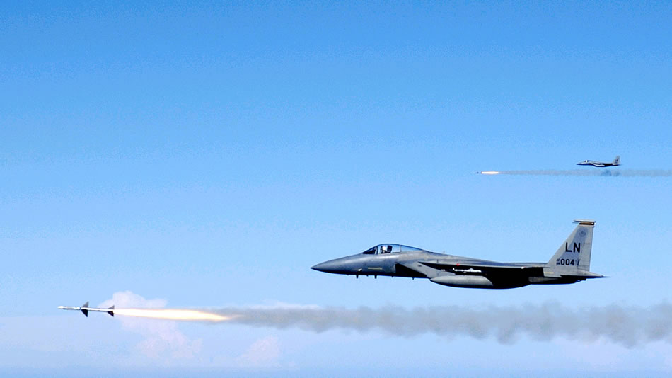 OVER THE GULF OF MEXICO -- Capts. Matt French and Daniel Arkema fire AIM-7M Sparrow medium-range air-to-air missiles from their F-15C Eagles during an exercise here Aug. 3. Captains French and Arkema are pilots with the 493rd Fighter Squadron at Royal Air Force Lakenheath, England. (U.S. Air Force photo by Master Sgt. Michael Ammons)